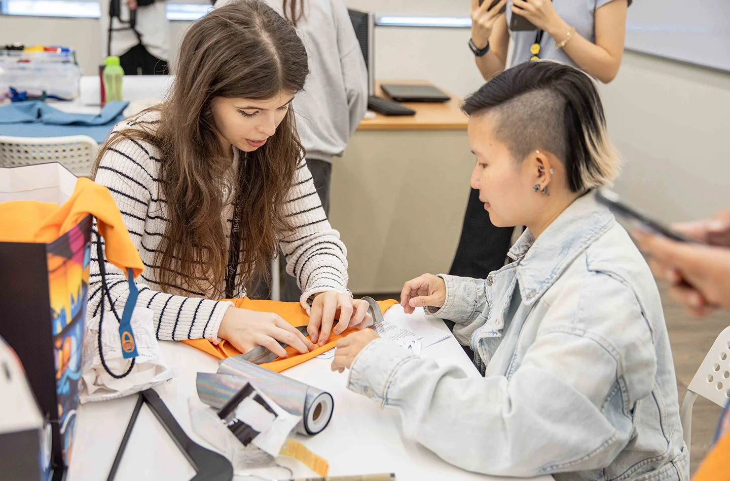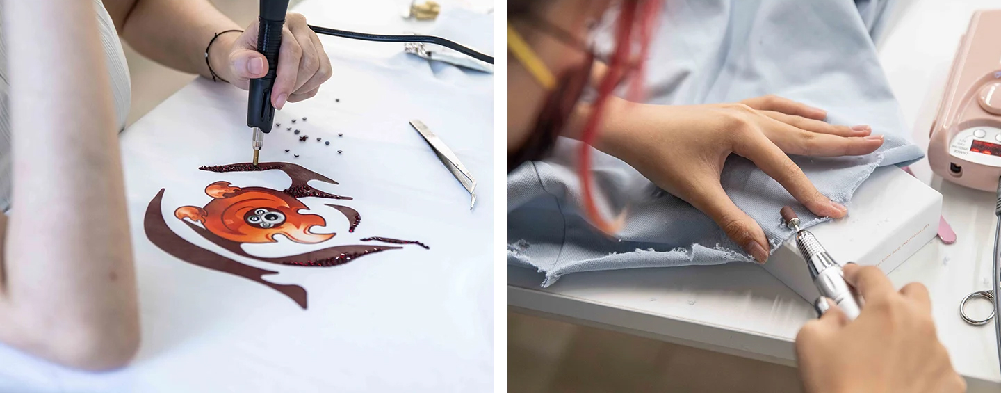 The process of designing was broken down into stages—from initial illustration proposals to material modifications and final enhancements. Students also applied skills from their fashion classes, like fabric manipulation, customizing shapes, and creating unique patterns. The workshop’s atmosphere was buzzing with creativity and energy as students bounced ideas off one another. Some went all out, bedazzling their designs, cutting and reshaping shirts and even incorporating intricate macramé details using strings.